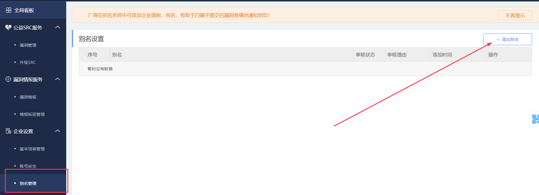 1) 如企业注册名称为“补天漏洞响应平台”,漏洞归属企业名称为“补天平台”, “补天平台”为“补天漏洞响应平台”简称,则需要添加别名“补天平台”,方可认领补天平台名下的历史漏洞;