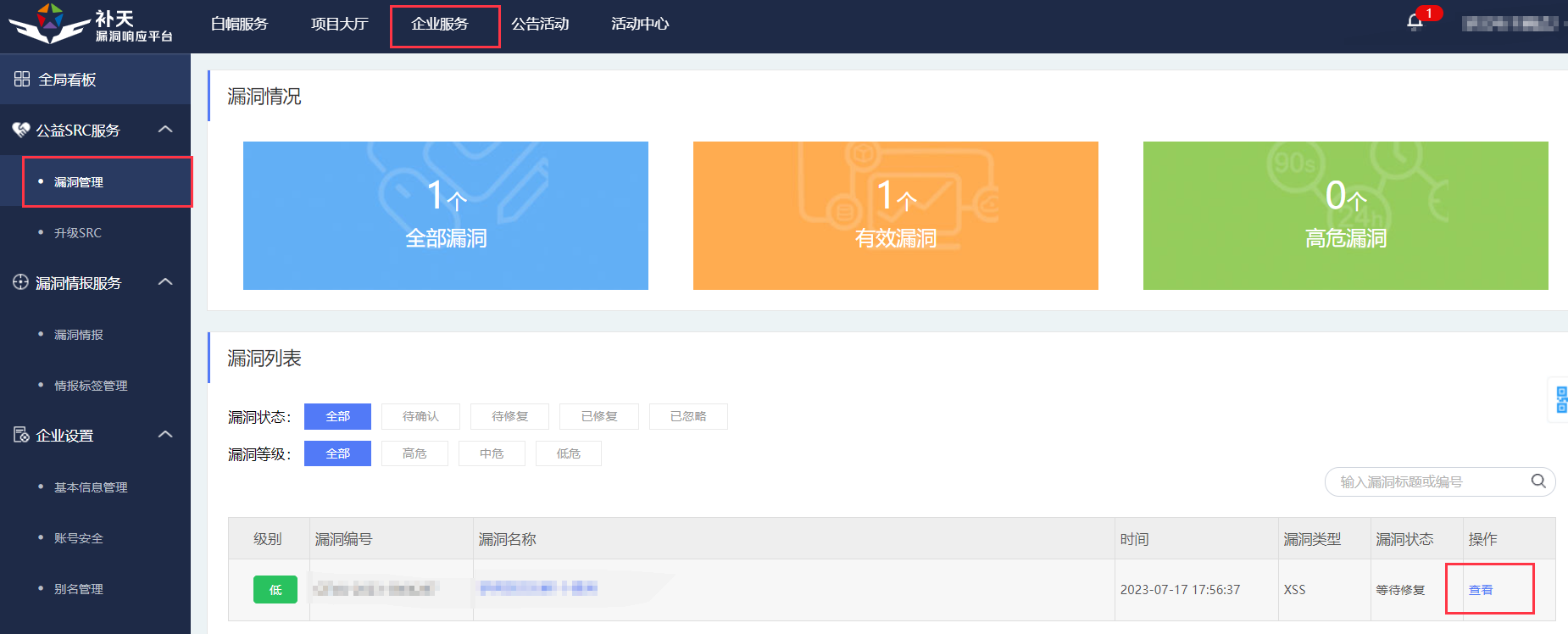 未注册企业认领漏洞需要注册成为补天”公益SRC”用户,即可在企业操作后台查看并处置漏洞。