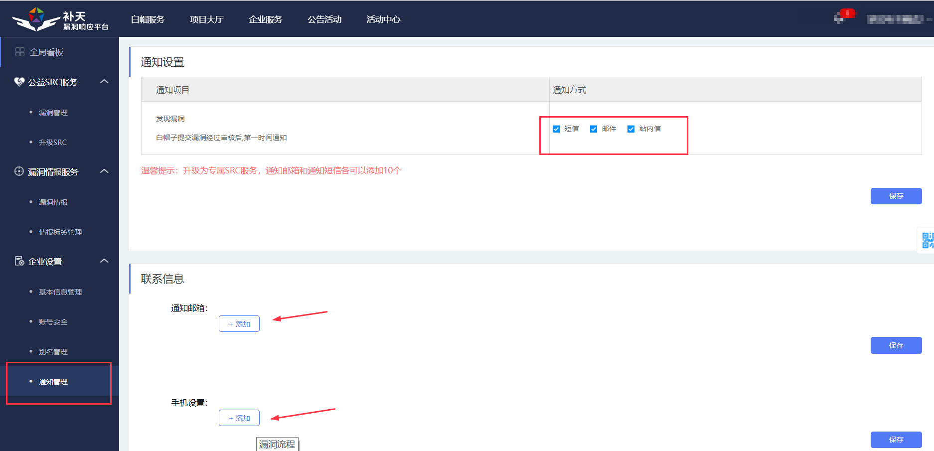 用户通知:补天如收到企业漏洞,将会通过邮件、站内信等形式发送告警信息通知企业,用户可在“企业设置——通知管理“模块下添加通知邮箱,公益用户可以添加3个通知邮箱,未设置通知邮箱的用户将默认发送企业联系邮箱。
