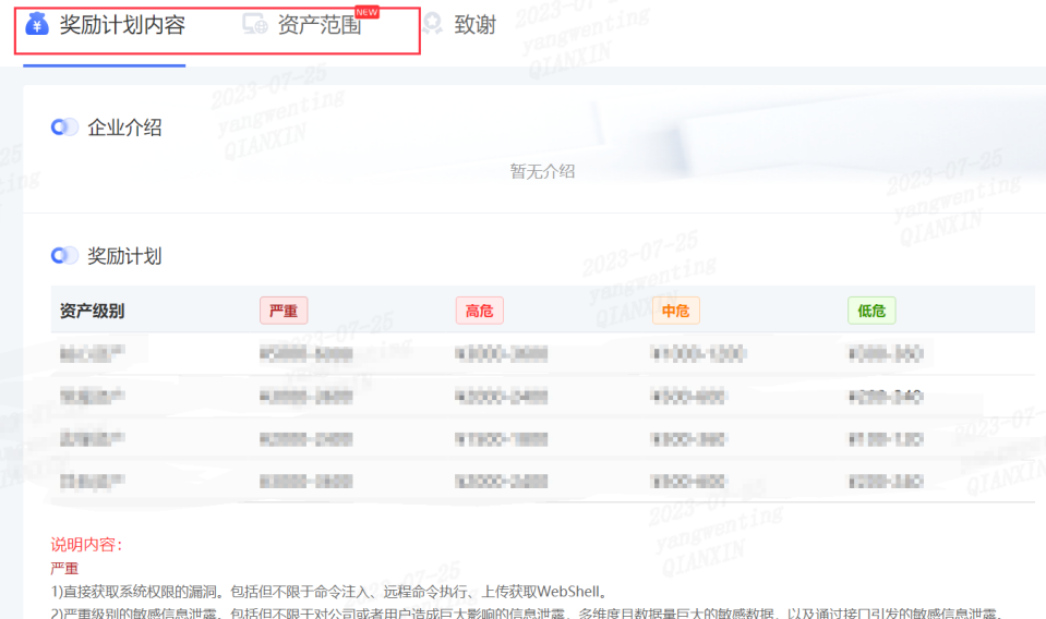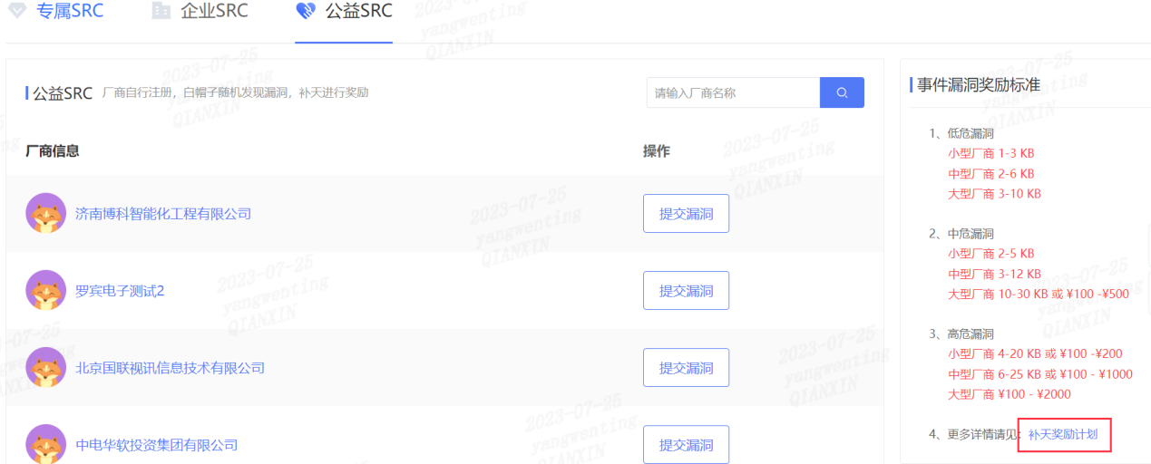 专属SRC是由厂商进行奖励计划的设置,规定白帽的可测范围以及不同等级的漏洞奖金范围,白帽子可以点击厂商查看具体的奖励计划