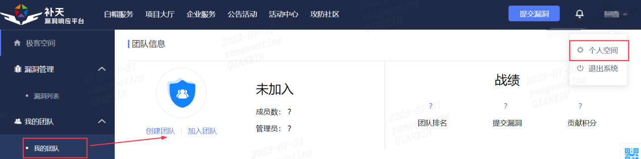 白帽子可以点击-个人空间-我的团队,进行团队的创建或者加入