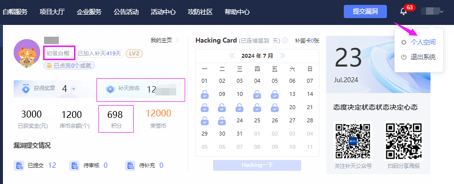 进入【个人空间】可查看补天积分、补天称号、补天排名